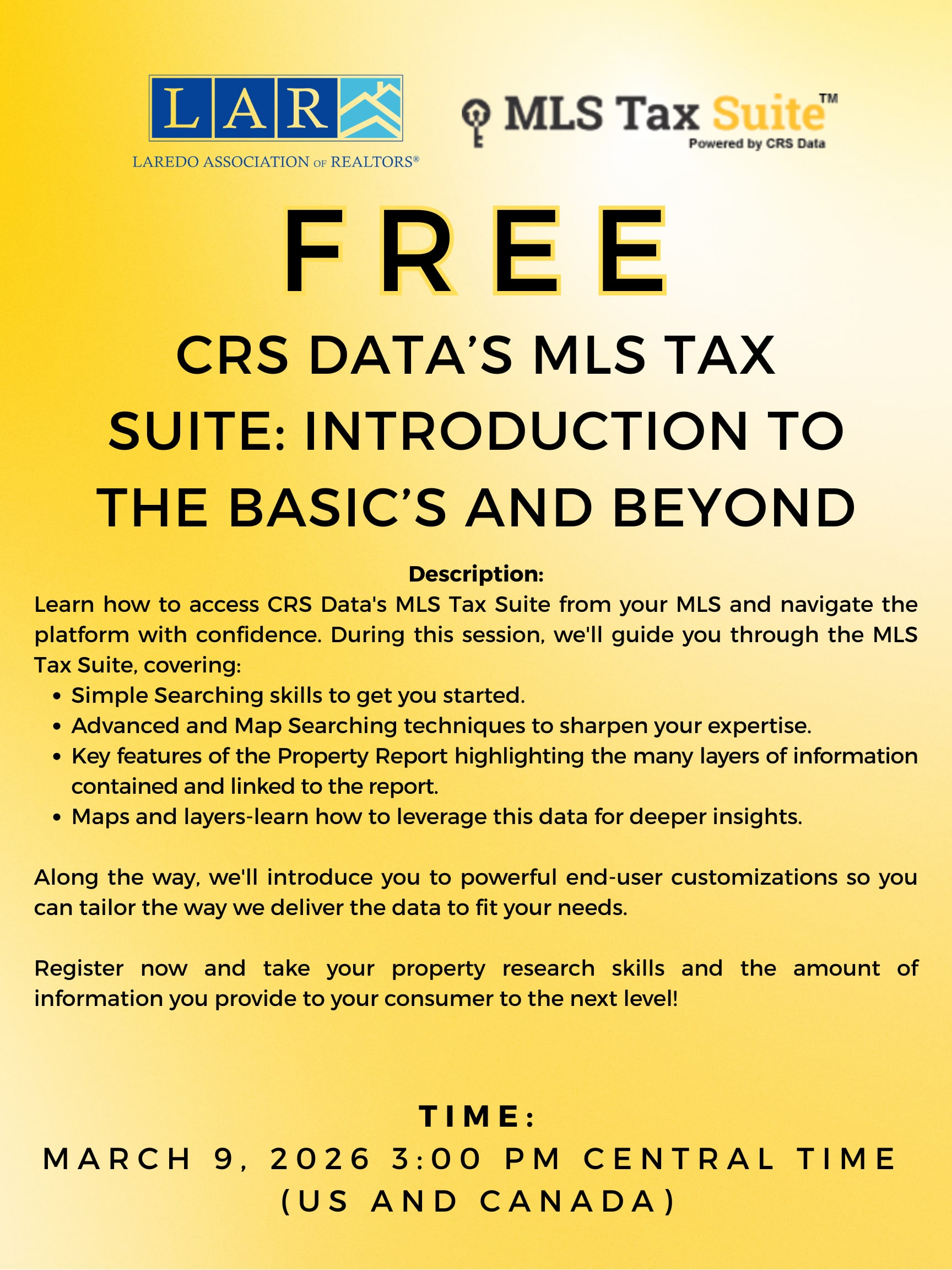 Learn how to access CRS Data's MLS Tax Suite from your MLS and navigate the platform with confidence. During this session, we'll guide you through the MLS Tax Suite, covering: